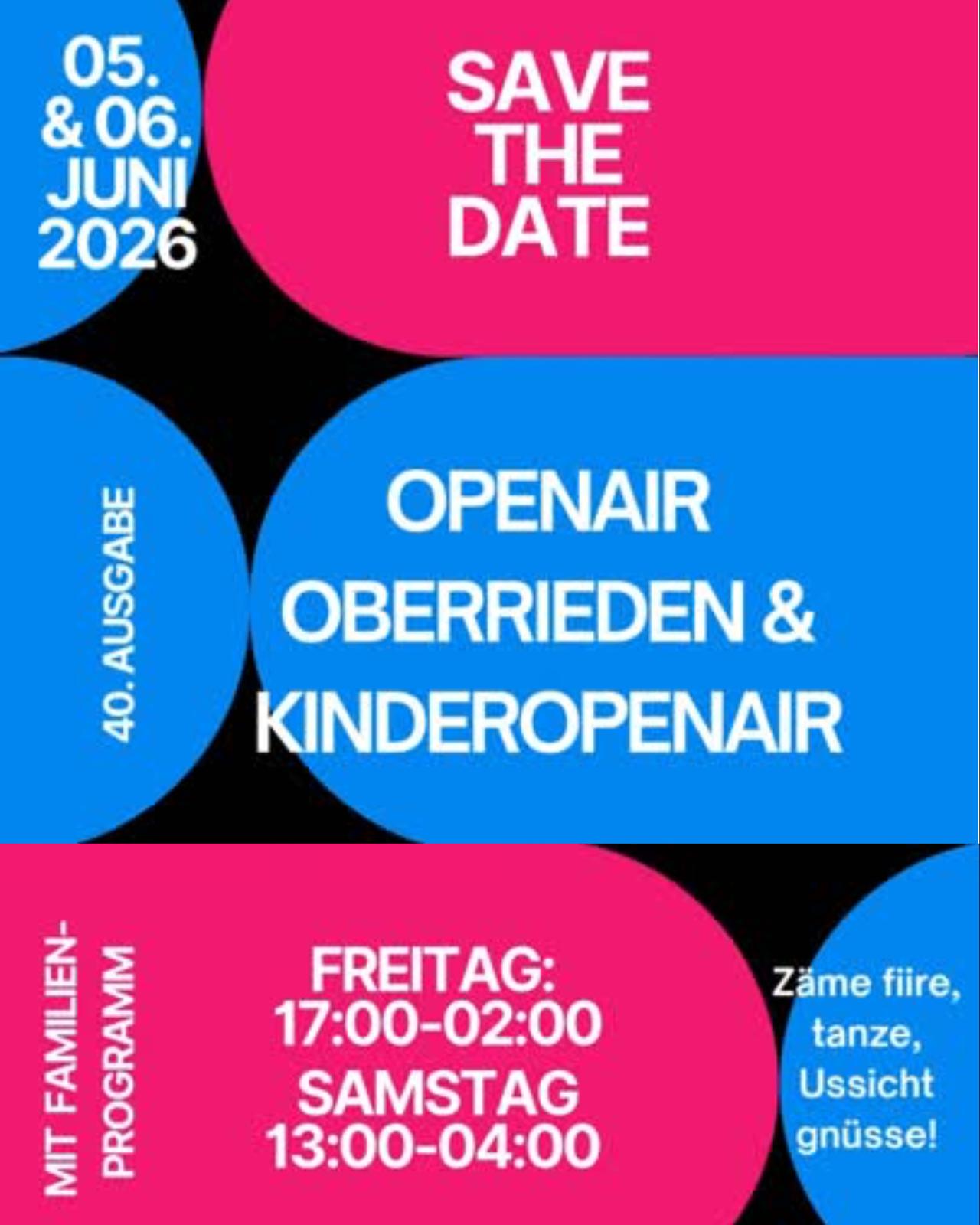 Am 05. & 06. Juni 2026 feiern wir die 40. Ausgabe des Openair Oberrieden. Und wir möchten, dass ihr ALLE dabei seid! Gross und klein, alt und jung, die Jubiläumsausgabe wird für alle sein! Deshalb, liebe KOA Family: Tragt euch den Termin jetzt schon in eure Agenda ein und kommt zu uns an den Berg zum Motto „zäme fiire, tanze, Ussicht gnüsse“!